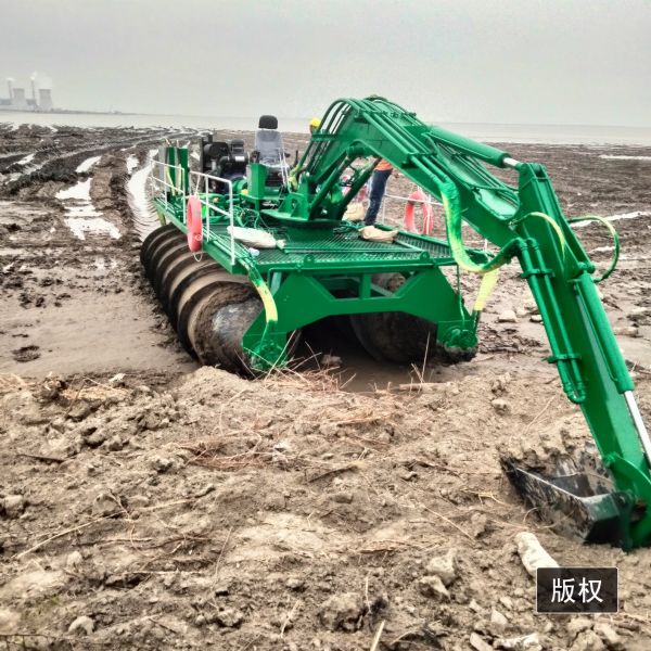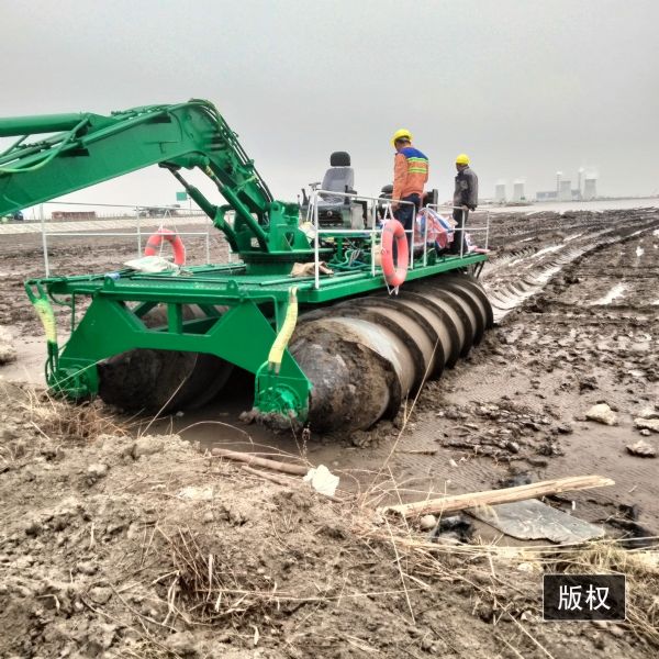 今天為大家介紹一款水陸兩棲神器,螺旋互花米草收割設(shè)備主要應(yīng)用于灘涂、泥地 、沼澤、淺海等。它的工作原理兩個螺旋轉(zhuǎn)筒產(chǎn)生直線向前的驅(qū)動力,就像擰螺絲的道理一樣,帶動我們整個機(jī)器向前行駛。它的兩個螺旋轉(zhuǎn)筒是中空的,可以漂浮在海面上行駛。它用于灘涂收割互花米草