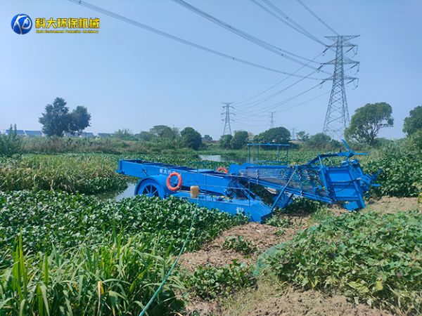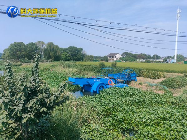 小型全自動(dòng)水葫蘆打撈船在江蘇順利下水,該船用于收割打撈水面水生植物。