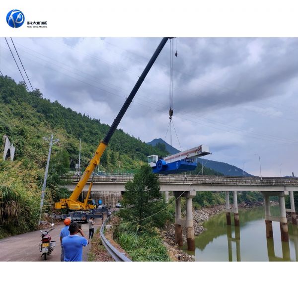 大型全自動垃圾打撈船在湖南順利下水 該船用于收割打撈水面垃圾、樹枝、塑料瓶、水草等水面漂浮物